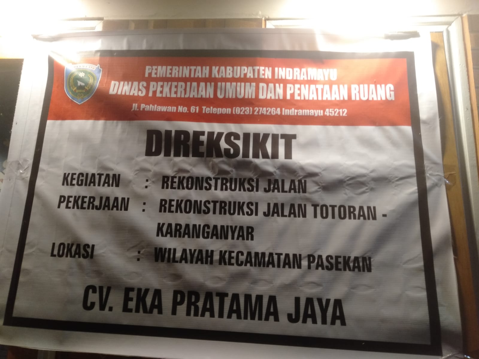Berdasarkan papan informasi, yang berlogo Pemerintah Kabupaten Indramayu Dinas Pekerjaan Umum dan Penataan Ruang (PUPR) tersebut, pekerjaan rekonstruksi jalan Totoran – Karanganyar ini dikerjakan oleh CV Eka Pratama Jaya.