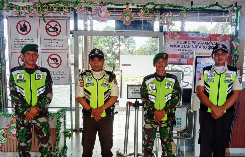 Indramayu—Dalam rangka memastikan keamanan dan kenyamanan masyarakat menjelang perayaan Natal 2024 dan Tahun Baru 2025, Koramil 1604/Jatibarang melaksanakan kegiatan pengamanan di Stasiun Jatibarang, Desa Jatibarang, Kecamatan Jatibarang, Kabupaten Indramayu, Kamis (26/12/2024).